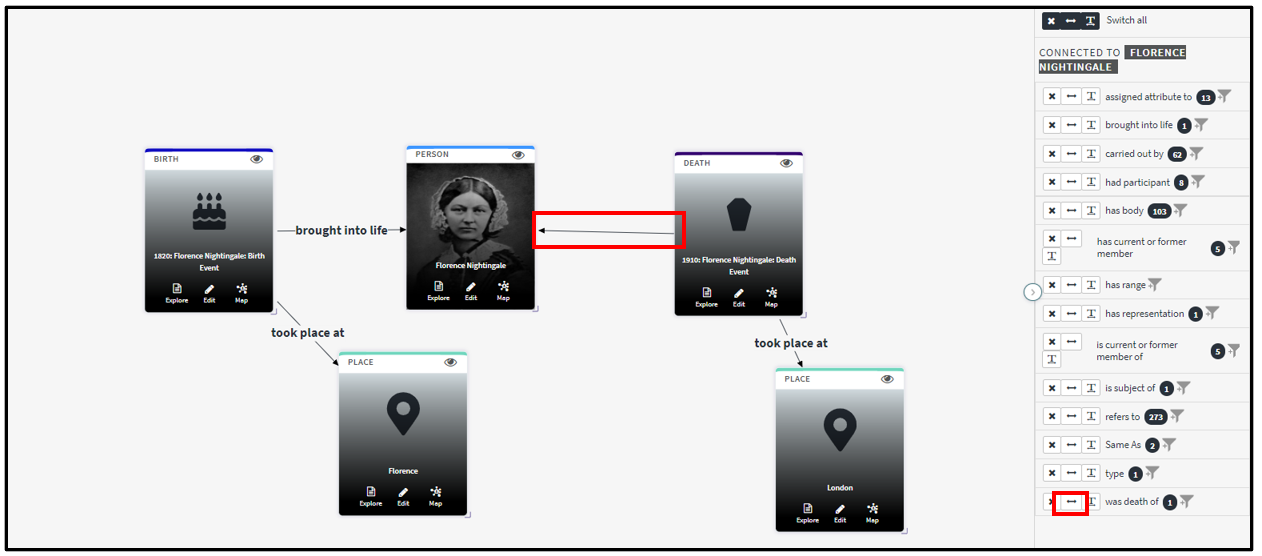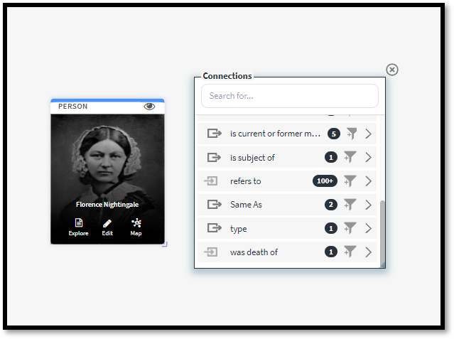This Connections box shows some of the outgoing statements (is current or former member, is subject of, Same As, type) and incoming statements (refers to, was death of) for the person Florence Nightingale. Take note of the icons that represent incoming and outgoing statements.