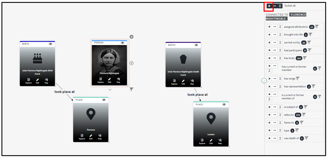 Click the X in the black box at the top of the connections panel to remove links and labels connected to the highlighted Entity Card, Florence Nightingale.