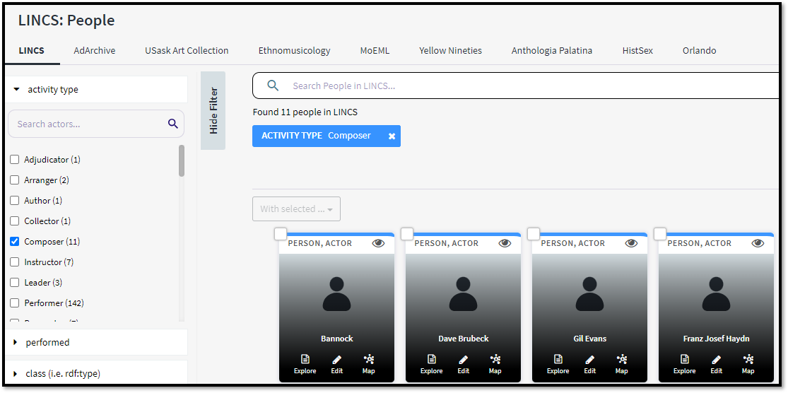 Discover the breadth of humanities data published by LINCS by selecting one of the browsing options available on the homepage: