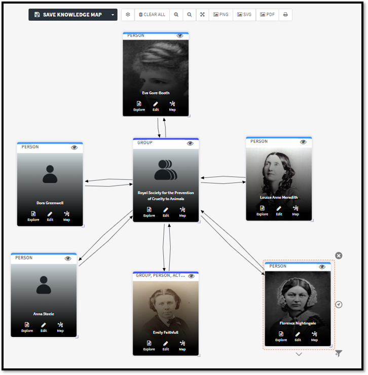 You can view all the incoming and outgoing statements connected to an entity within the Knowledge Map. The following image shows Florence Nightingale in a Knowledge Map and some of her associated connections.