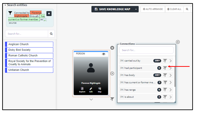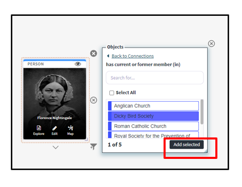 Open the connections panel to show the options for editing the links connected to the highlighted Entity Card, Florence Nightingale.