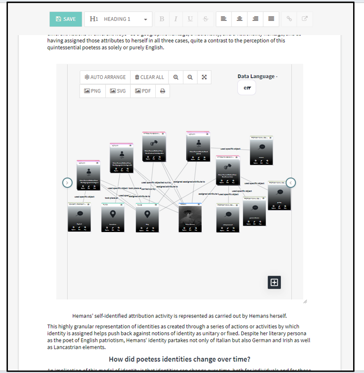 The Semantic Narrative is a unique feature of ResearchSpace that lets you embed data and Knowledge Maps into a document. You and your readers can engage with your argument and your data in one place. If you make changes to the data, these changes will be reflected in the document as well.