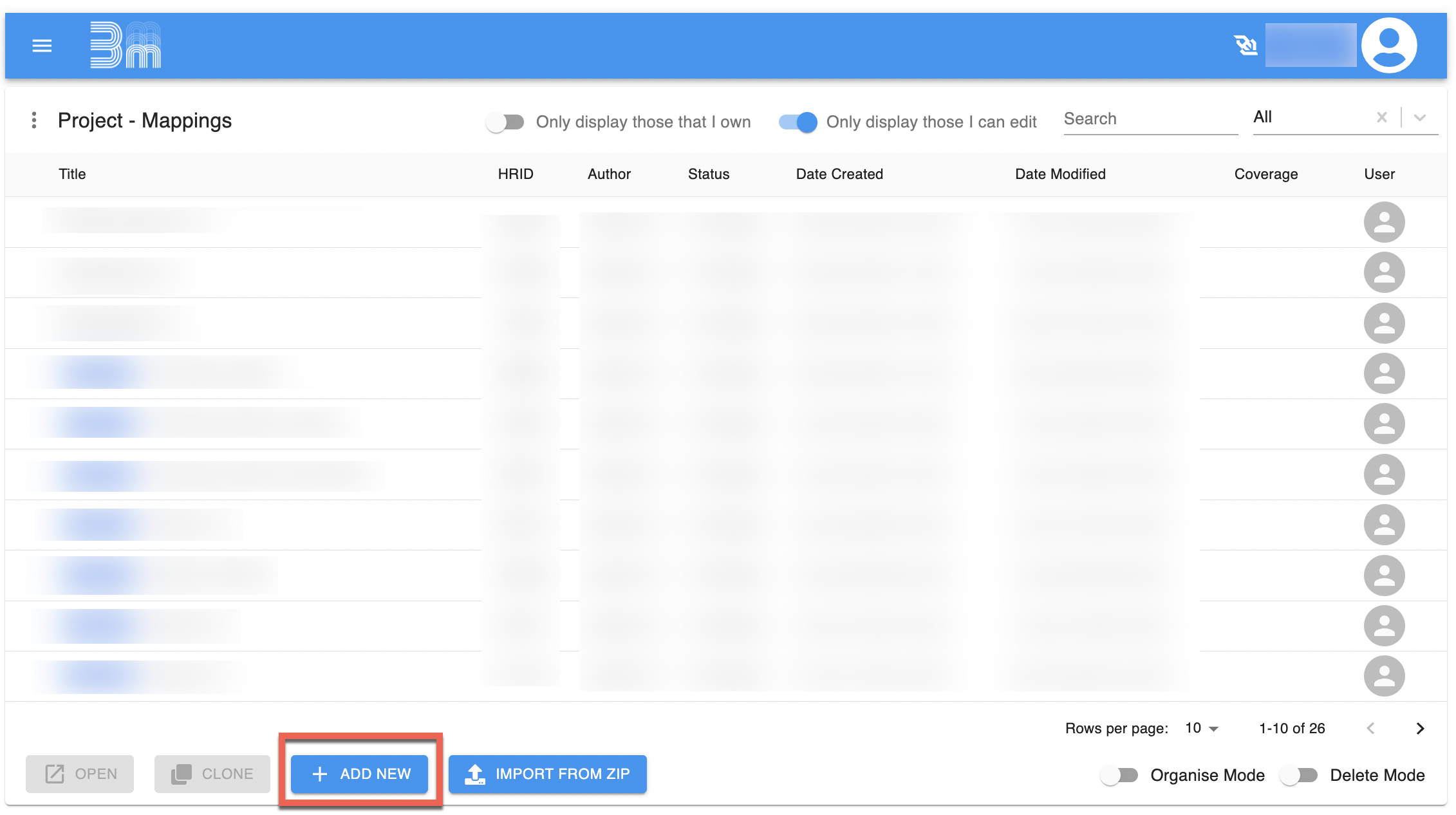 | La page Mappages de projet avec le bouton Ajouter nouveau indiqué. |