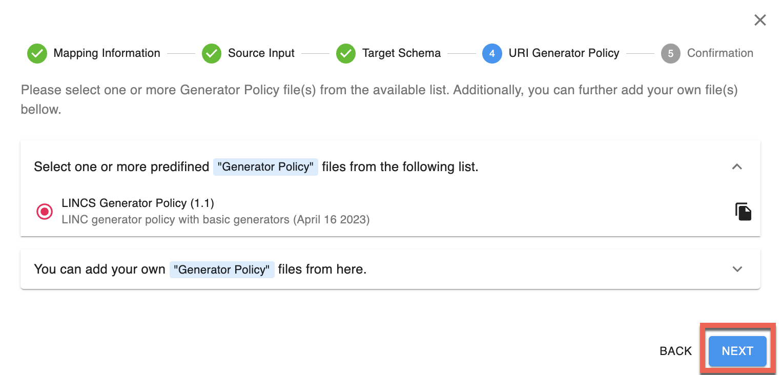 - Sélectionnez LINCS Generator Policy (1.1). Il s'agit de la politique relative aux générateurs de base utilisé par LINCS.